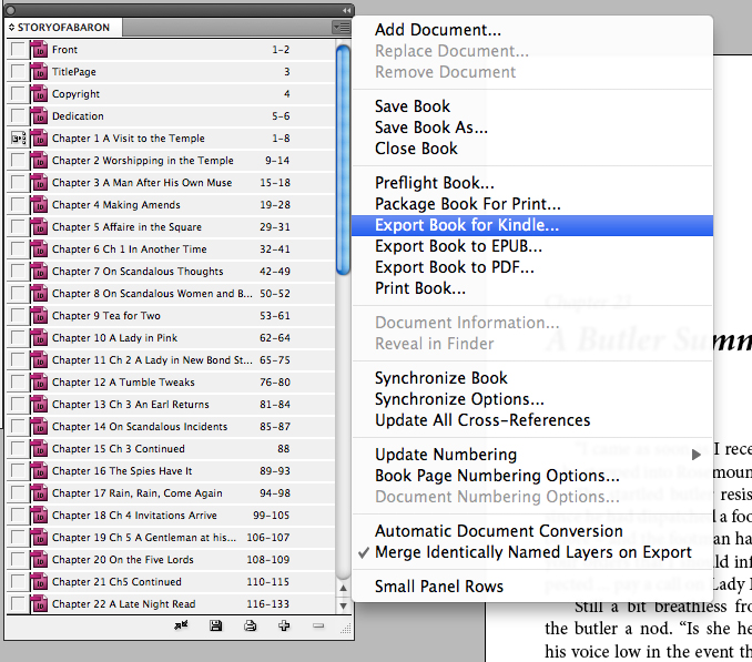 - From the bookfile palette menu, choose Export Book for Kindle