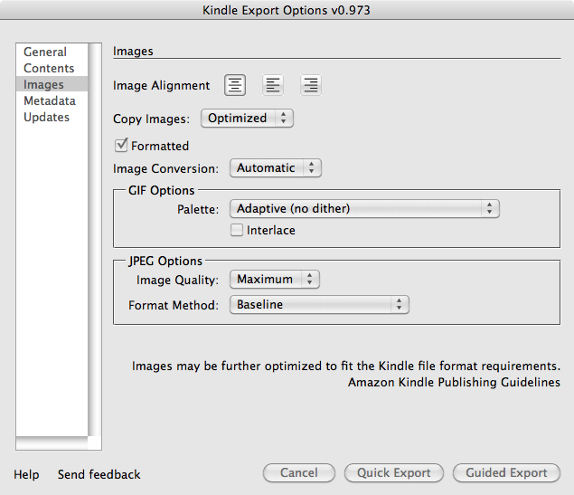 In the Kindle Export Options dialog, complete the following: