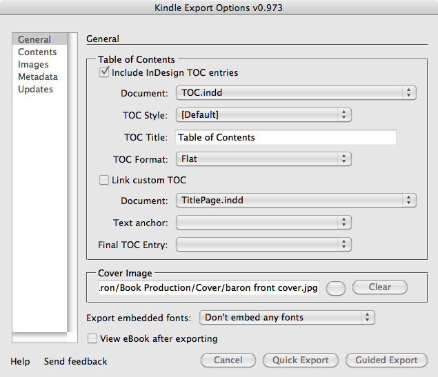 - Note: You may see an error warning the first time you attempt to generate a .mobi file. Simply select Export Book for Kindle from the bookfile again. All the information you entered in the Kindle Export Options pane will still be there. Click Guided Export and the conversion should begin.
